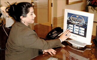 Hotel staff and hotel guests simply touch the screen to find information. The graphics on the main screen page are customized for each hotel, and nine information categories are presented to the user. Each main screen category is followed by a variety of subcategories to provide a quick and clear path to the desired information. Upon finding the information, the user is presented with general information and given the opportunity to view additional information, print detailed information, view a full-screen video, make a direct connection for reservations, or to continue looking for other information.